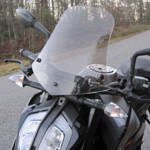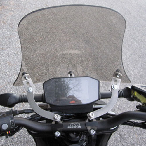 Parabellum designed a Flyscreen and Sport Touring Windshield for the KTM 790. The Flyscreen offers protection with a minimal look. It is made of 3/16 inch cast acrylic and is 14 inches tall. It has a maximum width of 14 inches, tapering to 9 inches at the top. It comes complete with hardware and is offered in clear or tint.