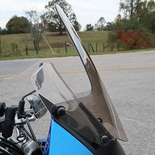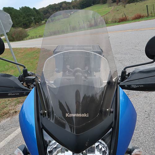 The long over-due rally shield for the 2008-on KLR 650 is finally here! Parabellum uses 4 steel brackets mounted to factory locations as well as our stand-off windshield design to ensure the customer doesn’t have to drill extra holes in the cowling but still achieves that iconic upright look of the real Dakar Rally bikes. The Rally shield protects the rider’s torso/chest from air, cold, roost, branches and bushes while leaving the rider’s head/helmet in clean air. We recommend the Rally shield for riders seeking some protection, but prefer to be off-road. The Rally shield is made from 1/8 inch cast acrylic and is 11.5 inches wide at the bottom and 17 inches tall.
