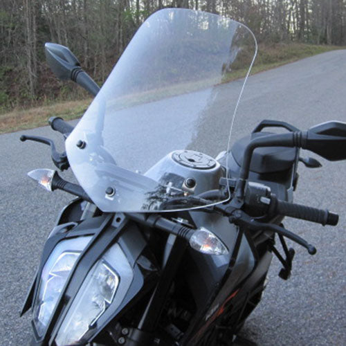 Parabellum designed a Sport Touring Windshield and a Flyscreen for the KTM 790. The Sport Touring shield is made for comfort on long distance rides as well as shorter commutes. It is made of 3/16 inch cast acrylic. It comes complete with hardware and is offered in 3 heights and in clear or tint. The Sport Touring windshield has a maximum width of 17 in and tapers to 14 in at the top.