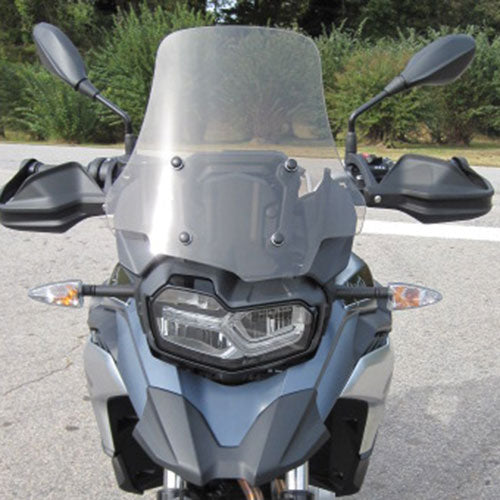 Parabellum has designed a Rally shield and a Touring shield which offer the best protection in the dirt and on the street. Both windshields are bolt on replacements and come complete with new fasteners. The stock BMW flyscreen is 8.5 inches tall and 12.5 inches wide at the widest point. The Parabellum Rally shield is much more substantial at 18 inches tall, 15.5 inches wide at the widest point tapering to 9.5 inches at the top of the windshield. The shields are made from 3/16 inch cast acrylic for excellent clarity and are offered in clear or tint.