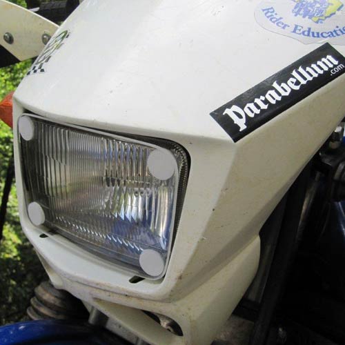 After too many personal dual sport adventure rides ending with expensive broken headlights, Parabellum Ltd. has designed headlight covers for dual sport bikes. These headlight guards, made of military aircraft grade 3/16 inch cast acrylic, protect vulnerable headlights from rocks, roost, branches and mud. These covers take the hit so your headlight does not. Optical clarity of the cast acrylic ensures headlight brightness and projection are minimally effected while impact and abrasion properties ensure headlights will survive through gravel and rock impacts. These guards are held securely to the headlight with an industrial strength hook and loop Velcro system.