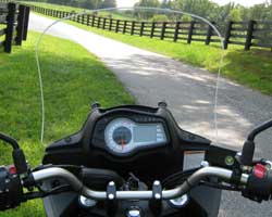 The Parabellum windshield for the 2012 Suzuki 650 V-Strom uses an advanced design incorporating a aerodynamic compound curvature for a quiet ride and better gas mileage. It is made from 3/16 inch thick, military aircraft grade cast acrylic, used for it's optical clarity. It is offered in 3 heights and in clear or tint. The Parabellum windshield is 5 inches wider than stock at 19 inches wide. NOTE: everything got better when we used mirror offsets (included) to allow the windshield to be just enough wider so it works really well. This windshield is a direct replacement and it mounts to the stock mounting points with new fasteners provided. Picture shown is 22 in.