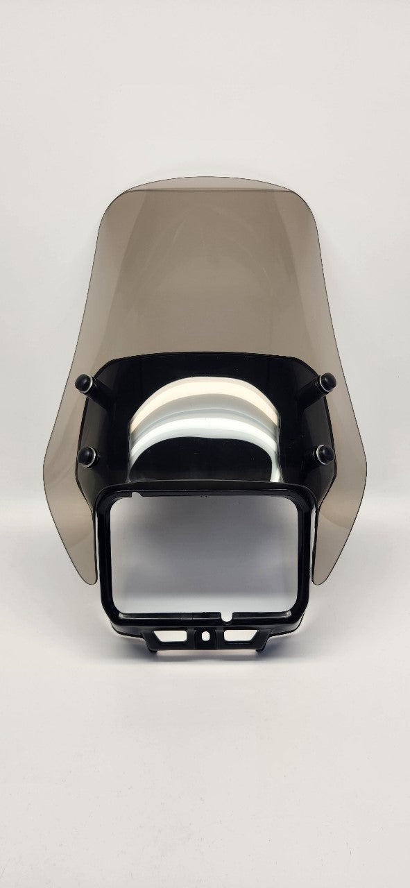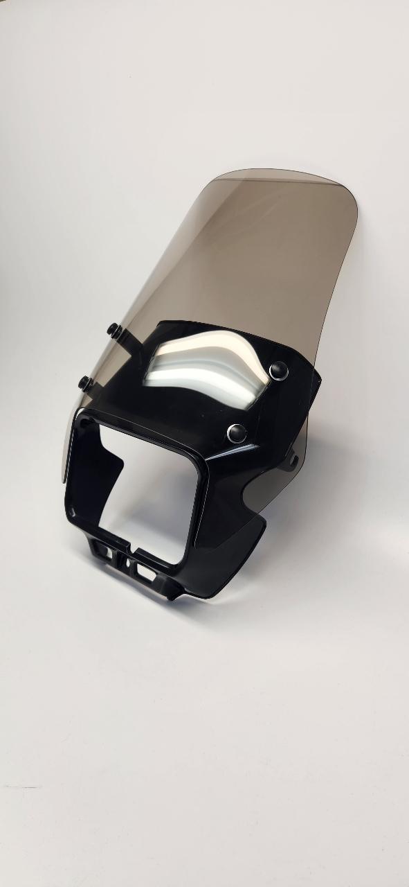 The Rally shield for the TW200 is 13 inches tall, 12.5 inches wide at the bottom, 9 inches wide at the top, and made from military grade 1/8 inch cast acrylic in either clear or tint.