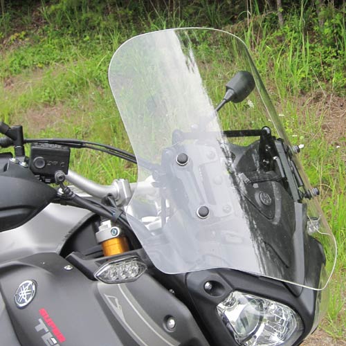 The Parabellum windscreen for the 2014 Yamaha Super Tenere is made of 3/16 inch military aircraft grade cast acrylic and is a direct replacement shield attaching to the stock mounts and retaining the adjustability. The Parabellum windshield is 18 inches wide tapering at the top to 15.5 inches. (stock screen is 16.5 inches tapering to 12.75 inches at the top) It comes complete with new fasteners and accommodates the stock hand guards with no clearance issue at full lock. The Parabellum windscreen turns this big adventure dual sport bike into a great touring machine that you can log lots of comfortable turbulent free miles on. It is offered in three heights and in clear or tint.
